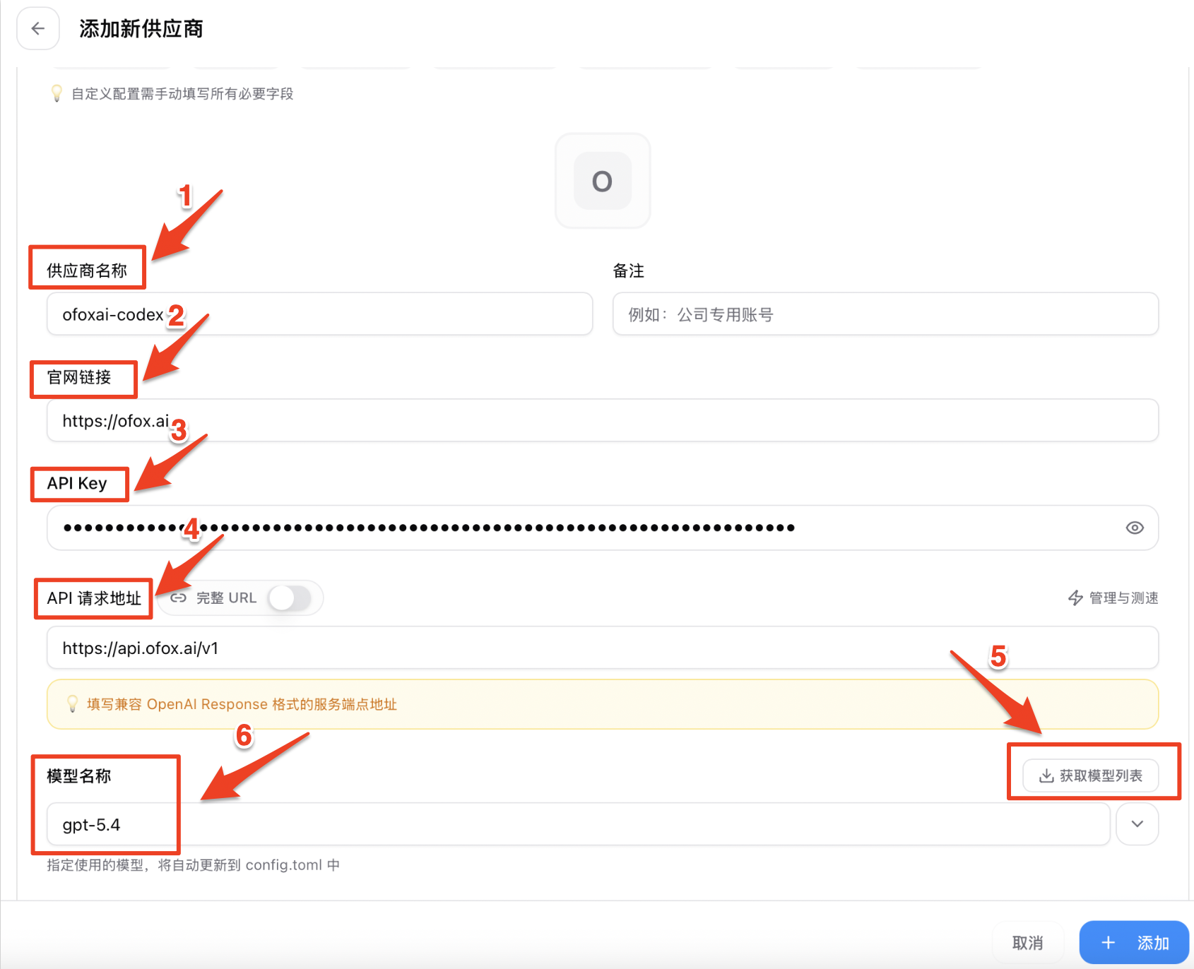 | ❶ Provider Name | ofoxai-codex | Custom name for easy identification |