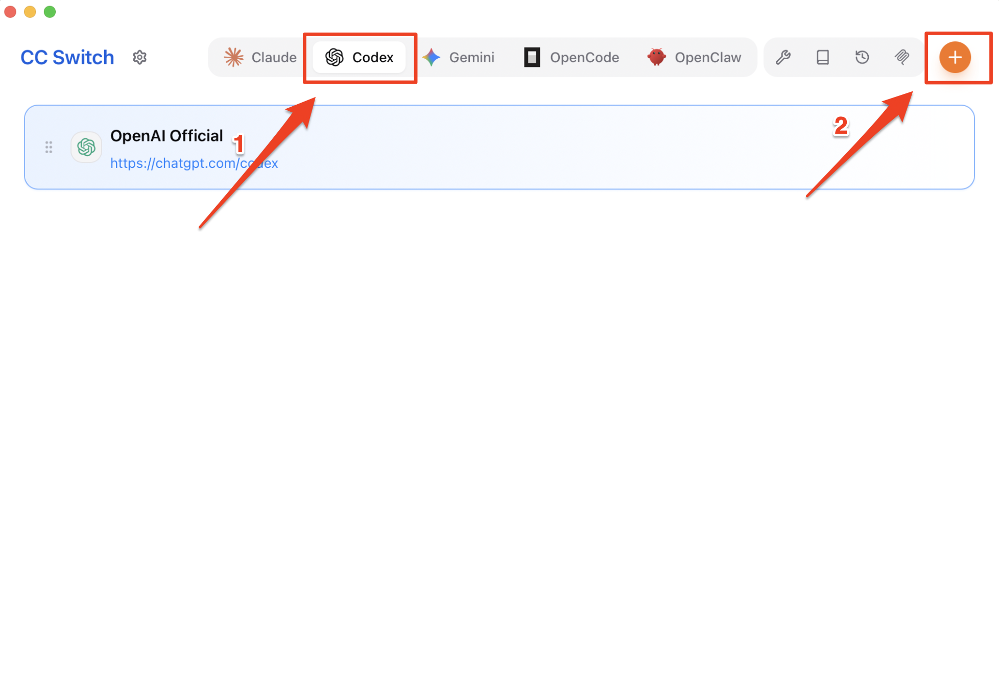 Switch to the Codex tab at the top, then click the + button in the top-right corner.
