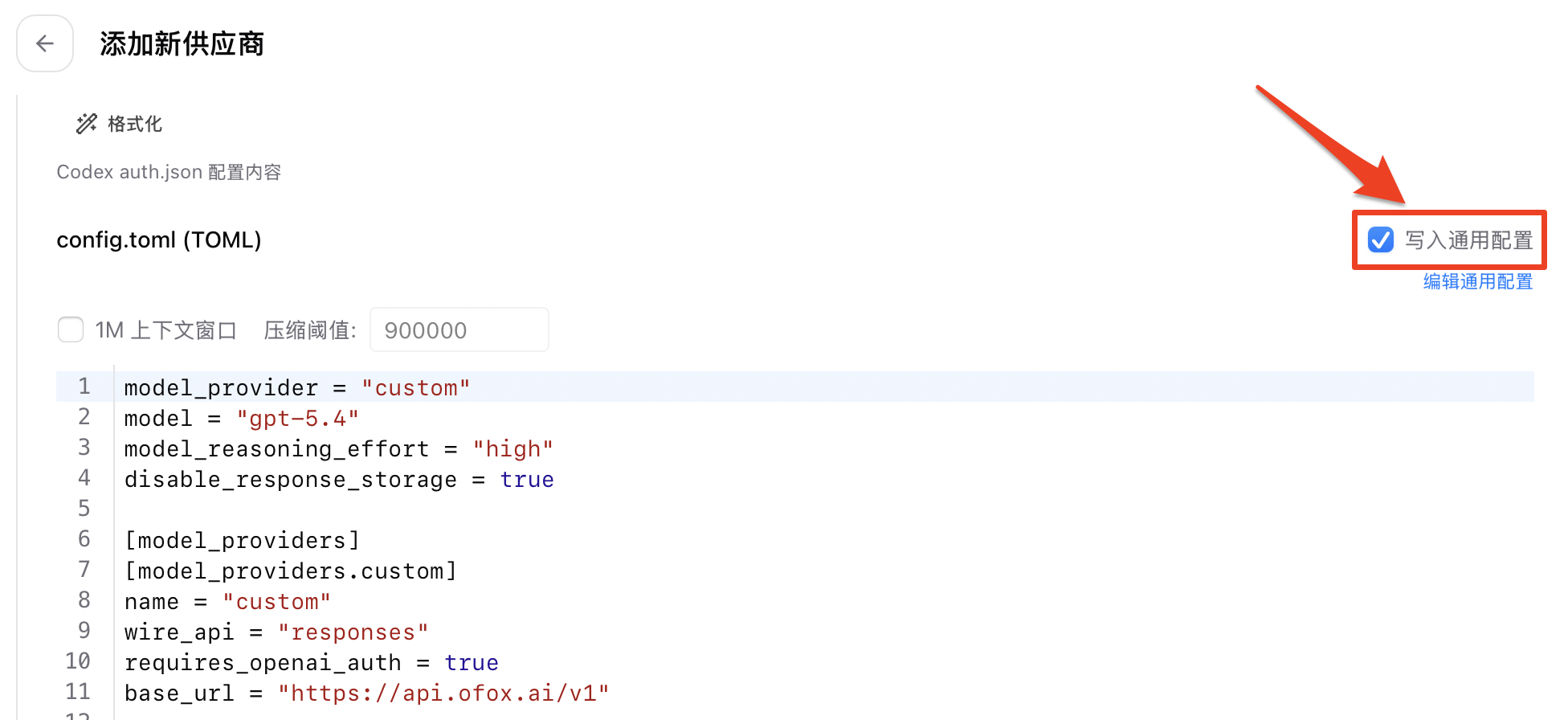 After adding, go back to the list, select ofoxai-codex, and click Use. Make sure Write to global config is checked — the settings will be automatically written to config.toml.